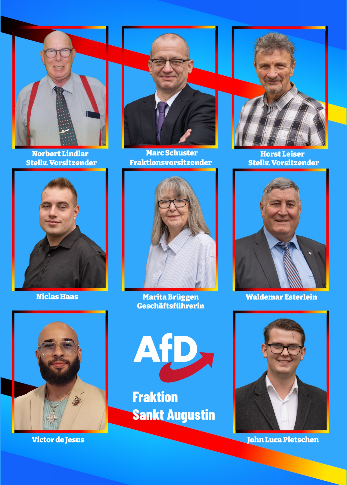 Mit 8 Mandatsträgern im Stadtrat Sankt Augustin stehen wir für eine Politik des gesunden Menschenverstands, klarer Haltung und echter Verantwortung gegenüber den Bürgern. Wir engagieren uns für Sicherheit, solide Finanzen, eine funktionierende Infrastruktur und den Erhalt unserer Heimat – sachlich, verlässlich und nah an den Menschen. Gemeinsam gestalten wir die Zukunft unserer Region.
